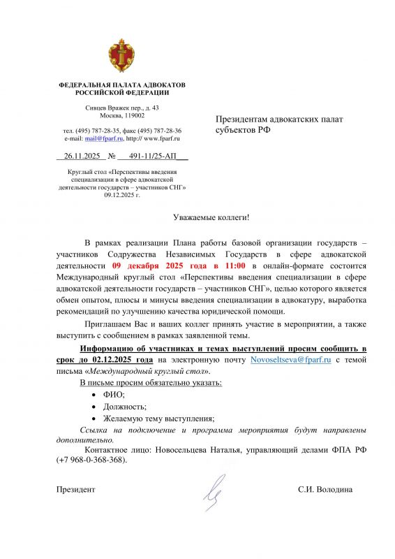 Контактное лицо: Новосельцева Наталья, управляющий делами ФПА РФ