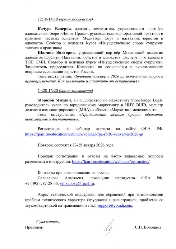 Регистрация на вебинар открыта на сайте ФПА РФ: https://fparf.ru/education/webinars/vebinar-fpa-rf-20-yanvarya-2026-g/