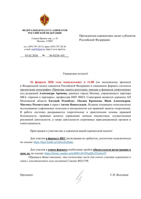 16 февраля 2026 года (понедельник) в 11:00 (по московскому времени) в Федеральной палате адвокатов Российской Федерации в смешанном формате состоится презентация монографии «Правовая защита репутации, имиджа и финансов спортсменов» под редакцией Александра Аронова, адвоката города Москвы, управляющего партнера МКА «Аронов и партнеры», профессора НИУ ВШЭ. Соавторами являются адвокаты АП Московской области Евгений Розенблат, Оксана Кромская, Иван Александров, Магомед Рахматулаев и юрист Антон Новосельцев. Издание посвящено комплексному исследованию современных подходов и инструментов для правовой защиты спортсменов. В работе системно раскрываются теоретические и практические основы правовой безопасности, правовые аспекты управления личным имуществом, осуществления рекламной деятельности, а также деятельности спортивных юрисдикционных органов и ответственности.