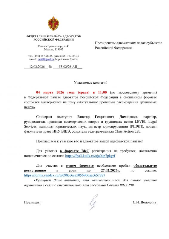 Обращаем Ваше внимание, что количество мест для очного участия ограничено в связи с вместимостью зала заседаний Совета ФПА РФ.марта 2026 года (среда) в 11:00 (по московскому времени) в Федеральной палате адвокатов Российской Федерации в смешанном формате состоится мастер-класс на тему «Актуальные проблемы рассмотрения групповых исков».
