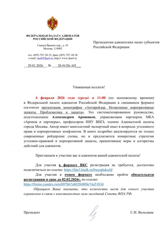 4 февраля 2026 года (среда) в 11:00 (по московскому времени) в Федеральной палате адвокатов Российской Федерации в смешанном формате состоится презентация монографии «Антирейдер. Незаконные корпоративные захваты. Проблематика и защита». Это систематизированное руководство, подготовленное Александром Ароновым, управляющим партнером МКА «Аронов и партнеры», профессором НИУ ВШЭ, членом Адвокатской палаты города Москвы. Автор имеет многолетний экспертный опыт в вопросах уголовного права и корпоративных конфликтов. В книге подробно анализируются не только современные рейдерские схемы, но и предлагаются конкретные стратегии уголовно-правовой и корпоративной защиты, превентивные меры и алгоритмы действий для адвокатов.