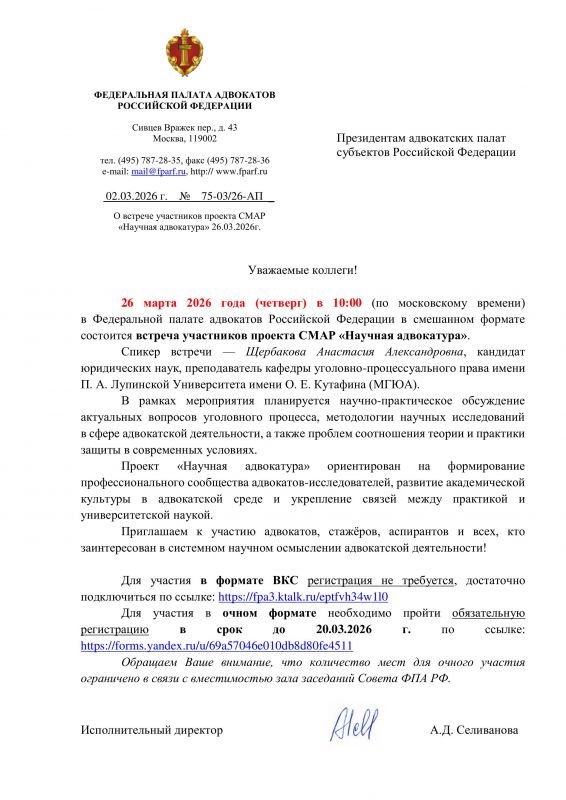 26 марта 2026 года (четверг) в 10:00 (по московскому времени) в Федеральной палате адвокатов Российской Федерации в смешанном формате состоится встреча участников проекта СМАР «Научная адвокатура».